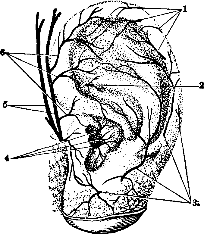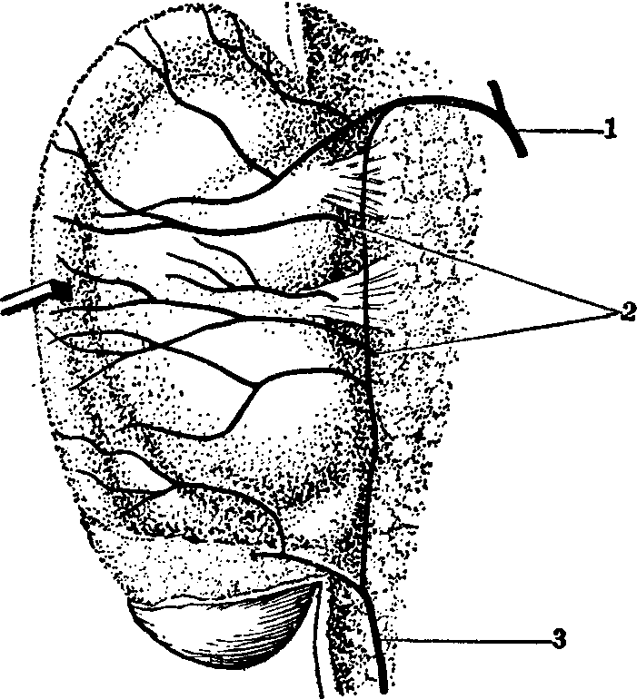 图2 耳郭的神经(后内侧面) 外耳的动脉 外耳接受颈外动脉的颞浅动脉、耳后动脉和上颌动脉的供应。耳郭前外侧面的动脉来自颞浅动脉的耳前支和耳后动脉绕(或穿)至耳郭前外侧面的支:耳郭后内侧面主要由耳后动脉的耳支供给,并有枕动脉的耳支分布。耳郭的皮肤内有丰富的动静脉吻合。外耳道血由颞浅动脉的耳前支、耳后动脉和上颌动脉的耳深动脉供给。后者还分布于鼓膜表皮层下; 而鼓膜粘膜层下则由上颌动脉的鼓室前动脉和茎乳动脉的鼓室后动脉分布并吻合成环。外耳的静脉一般和同名动脉伴行,主要回流至颞浅静脉、耳后静脉、上颌静脉、颈外静脉和翼丛等,鼓膜内侧面的静脉则汇入横窦、硬脑膜的静脉和咽鼓管的静脉丛。 外耳的淋巴 外耳的淋巴流注于耳郭周围的淋巴结。前部的流入腮腺浅淋巴结和腮腺深淋巴结; 后部的流入乳突淋巴结;下部的流入颈外侧淋巴结。 中耳的神经、血管和淋巴 中耳的神经 除鼓膜张肌和镫骨肌分别由下颌神经和面神经支配以外。中耳还另有鼓室丛等。此丛由舌咽神经的鼓室神经(含感觉和副交感纤维)和颈内动脉丛的颈鼓神经(含交感纤维)组成,另有面神经的鼓室丛交通支加入。鼓室丛在岬的表面分支,分布于鼓室、乳突气房和咽鼓管,司粘膜的感觉。鼓室神经的副交感纤维还延为岩小神经,支配腮腺。此外,三叉神经的咽支亦分布到咽鼓管,下颌神经的脑膜支亦分布到乳突小房。鼓索并不分布于中耳,但经过鼓室,手术时宜密切注意。它在面神经管垂直部内发自面神经,自鼓室后壁与外侧壁交接处穿入鼓室,在鼓室上份粘膜下前行,横过锤骨柄上部与砧骨长脚之间,再经岩鼓裂出鼓室。 中耳的动脉 鼓室前动脉发自上颌动脉,分布于鼓室前部、锤骨、砧骨和鼓膜,鼓室后动脉发自茎乳动脉,分布于鼓室后部、鼓膜、镫骨肌、乳突和乳突小房。此外,脑膜中动脉发出的鼓室上动脉和岩支、颈内动脉的颈鼓动脉、颌动脉的翼管动脉,以及咽升动脉的鼓室下动脉等,在鼓室粘膜下形成密网,继而发出细支分布于粘膜、肌和骨质。分布于咽鼓管的主要是翼管动脉的分支以及咽升动脉的咽支。中耳的静脉与动脉伴行。主要回流到翼丛和岩上窦。 中耳的淋巴 中耳的淋巴注入腮腺淋巴结、颈外侧深淋巴结和咽后淋巴结等。 内耳的神经、血管和淋巴 内耳的神经 前庭蜗神经(VIII)分布于内耳,它由蜗部和前庭部组成。蜗神经节位于蜗螺旋板的基部,节细