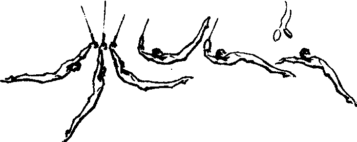 曾是50年代和60年代初初学者练习的简单动作,也是当时全国体育院系体操教学大纲中列有的一个动作。完成这一动作采用的是以握点为轴心的小摆技术。因此在60年代中期,悬垂大摆技术出现之后,这一动作很难适应体操的发展。它不仅没有列入历届竞赛规则的难度表中,而且也从初学者练习内容中去掉,更从全国体育院系体操教学大纲中淘汰。该动作做法是前摆过垂线之后,开始向前上兜腿,然后立即制动,两臂随即向侧下分压环,同时扔环放手。在此瞬间梗头、立即跟上体,挺胸、出背弓,然后面视前方准备落地。