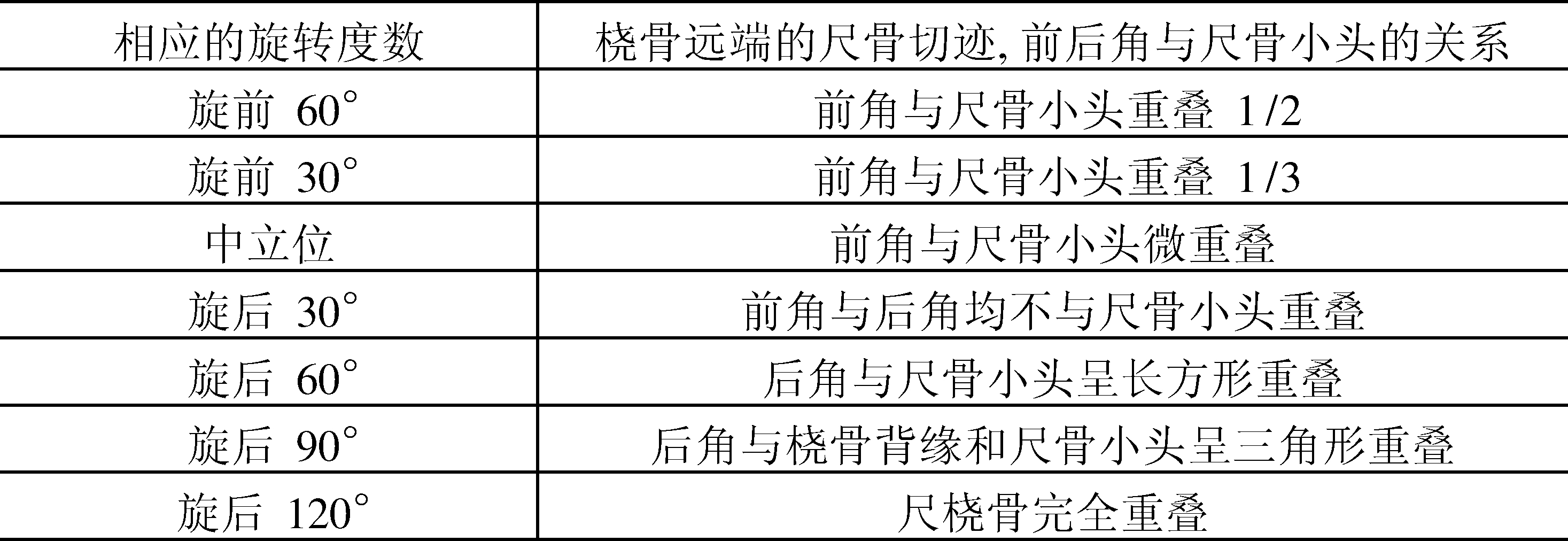 ❹尺骨茎突位置的变化。前臂骨旋转方向和程度与解剖标志的关系见下表: