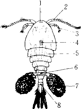 剑水蚤 1.眼 2.第一对触角 3 . 第二对触角 4. 卵巢 5.子宫 6.生殖孔 7.卵囊 8 . 肛门 剑水蚤 剑水蚤jianshuizaoCyclops无脊椎动物,节肢动物门,甲壳纲,桡足亚纲,剑水蚤目。身体细小,呈圆锥形,但背面微隆起,腹面较平。体节明显。身体可分为头胸部和腹部两部分。头胸部较大,呈卵圆形,背部前方有1个眼点。触角2对,第1触角较短,圆柱形,可用以游泳。雄虫的第1对触角弯曲成抱握肢。胸肢,又称游泳肢,5对,前4对双枝型,上有多数刚毛,第5对退化为短小的单肢。腹部细长,呈圆柱形,2个尾叉各有1簇尾毛。无鳃和心脏。用体表呼吸,血液靠体内肠的蠕动而流动。雌体所产的卵,藏于卵囊中,卵囊常挂附在腹部两侧。发育过程有变态。为淡水水域中的桡足类代表浮游动物,也是鱼类的天然饵料。