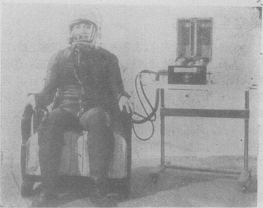 图1 TK-1型密闭头盔、DC-2型代偿服与YD地面加压供氧锻炼器连接图 (1)训练前准备: ❶卫生教育。包括高空环境因素对人体的生理影响及防护原则,全套高空供氧装备的工作原理、使用方法、可能出现的故障及排除方法,加压呼吸对人体的影响及应采取的呼吸动作要领等内容。 ❷身体检查。应着重耳鼻咽喉科及内科检查,特别是心血管功能检查。凡符合放飞条件者,均可参加训练。 ❸代偿服及供氧面具型号的选择与调整。因配套使用的TK-1型密闭头盔与DC-2型代偿服是根据飞行人员头型、面型及体型划分型号和号码的,故应根据对飞行人员头、面及身体进行人体测量的结果选择合适的型号和号码。代偿服选好后,先反穿针织品内衣,再试穿代偿服,并取坐姿进行预调带。其要求为不妨碍四肢和躯干的活动,不影响正常胸部呼吸运动(但深吸气可以略受影响)。若调节绳松紧调整合适,则在胸背部、髋部及大腿等部位的服装调节绳的下方应可容许有一或两个手指自由通过; 当用手指轻拉调节绳时,应可提起1~2cm。此外,还可进一步通过“拉力储备量”来检查调带的质量。所谓“拉力储备量”,即指在拉力管已充气情况下,代偿服被张紧后的剩余量,具体以拉力管底布两侧边缘距离的大小来表示。若距离大,则表明拉力储备量大;反之,则小。检查拉力储备量时,先将密闭头盔及代偿服各接头与YD地面加压供氧锻炼器相应的接咀相连接,再向代偿服拉力管内缓慢加压。当拉力管内充压至0.25~0.3kg/cm2时,靠近胸背及大腿部位的服装应有2~3cm的拉力储备量; 当充压至0.8kg/cm2时,这些部位服装的拉力储备量应接近于零。若发现拉力储备量过大,应将调节绳拉紧到最大限度。还可用肺活量法检查调带的质量: 即在穿妥服装而拉力管未充压的情况下,以穿用者的肺活量减少值不超过100~150ml作为调整合适的标准。在实际飞行中或低压舱上升训练时,还应对代偿手套及代偿袜进行选择与调整。密闭头盔(包括外壳、密封颈套及布制飞行帽)选好后,也要经过试戴及调整,并应做漏气量检查。选择与调整合适的密闭头盔不应压迫头部、颜面隆起部及耳部,密闭颈套应紧贴颈部而无压迫感。当密闭头盔内余压为1000mmH2O时,漏气量不应超过5L/min; 余压为1800mmH2O时,不应超过7.5L/min。 (2) 加压呼吸训练: 在将加压供氧服装及供氧面具各接头与YD地面加压供氧锻炼器相应的接咀连妥后,再接上生理功能记录导线,按上表内容及步骤加压。一般进行两次(隔日一次)。 使用YX-1 供氧系统进行加压呼吸训练的内容与步骤