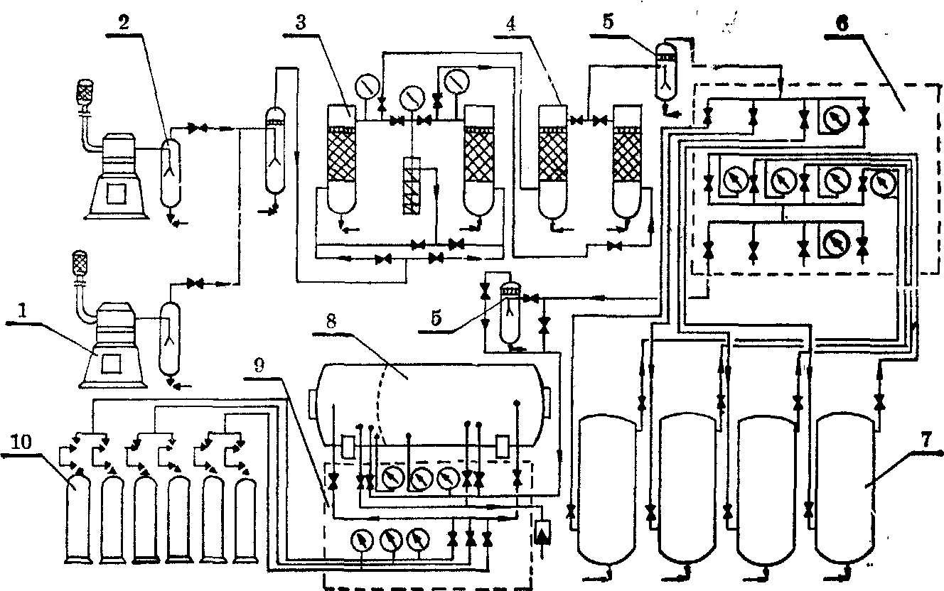 加压系统示意图 1.空气压缩机 2.油水分离器 3.干燥器 4.活性炭吸附器 5.过滤器 6.供气控制台 7.储气瓶 8.加压舱9.加压舱操作台 10.氧瓶