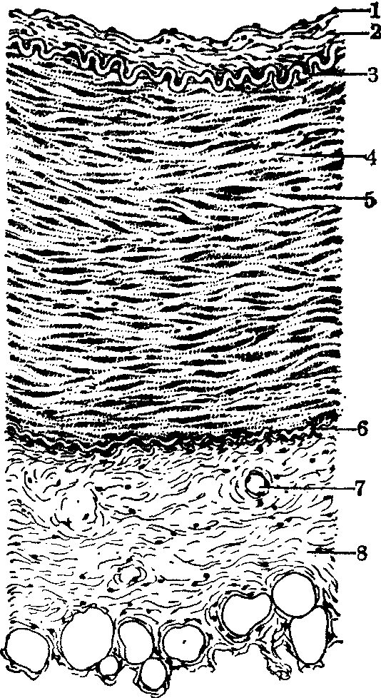 图2 中动脉的结构(低倍光镜) 1.内皮 2.内皮下层 3.内弹性膜 4.中膜5.平滑肌 6.外弹性膜 7.营养血管 8.外膜