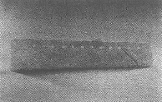 | 释义 | 十三孔石刀 十三孔石刀新石器时代(薜家岗文化)。长51.6厘米,宽9—12厘米。1980年安徽省潜山县出土。安徽省博物馆藏。石刀略近长条梯形,双面磨刃,背处有13个一面穿钻的喇叭圆孔,呈一字形排开,新颖美观,无使用痕迹。