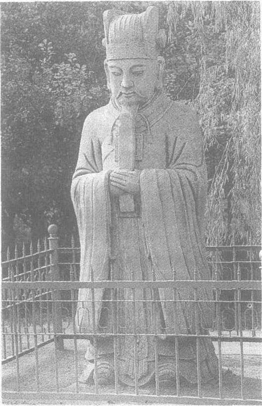| 释义 | 十三陵石文官 十三陵石文官明。高320厘米。北京市昌平县明十三陵神道石像生之一。白石雕制。文官头戴七梁冠,身穿高领宽袖袍,足蹬云头靴,双手执笏于胸前。其头微倾,长髯垂胸,恭顺而立,风度颇文雅。此像刀法娴熟,刻画准确,形神兼备。文官、武将作为石像生置于陵前,代表百官,藉以表示皇帝拥有生死相随的忠将良臣。明十三陵见“明十三陵”条目。