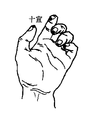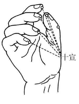 图2 十宣十指端去指甲一分处的穴位。 十宣shihhsüan系常用的针灸奇穴。共10穴,各位于指尖端距爪甲缝1分处。施针时用三棱针点刺出血。主治小儿惊风、高热抽搐、急性昏迷、休克等。 十宣经外奇穴名。别名“鬼城”。位于十指尖端去指甲游离缘一分处,左右共十穴。主治:昏迷,晕厥,中暑,热病,小儿惊厥,咽喉肿痛,指端麻木。直刺0.1—0.2寸,或用三棱针点刺出血。 十宣 十宣经外奇穴。取穴:在手十指尖端,距指甲0.1寸许。主治:一切急性之失神、吐泻、中暑、热病、指端麻木、晕厥、乳蛾、扁桃体炎、癫狂、短气不得语。刺灸法:浅刺0.1~0.2寸或针刺出血。局部痛胀。
