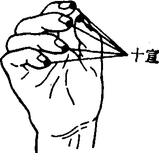 | 释义 | 古代名物 > 人體類 > 四肢部 > 經外奇穴 > 十宣 十宣 shíxuān 亦稱“鬼城”。經外奇穴。在兩手十指尖,距指甲一分處。因其在手十指尖上,共十穴,故名。主治暈厥,中暑,咽喉腫痛。其穴始載於唐代典籍,今沿稱。唐·孫思邈《備急千金要方·小腸腑》:“邪病大唤駡詈走。灸十指端,去爪一分。一名鬼城。”明·楊繼洲《針灸大成·經外奇穴》:“十宣十穴。在手十指頭上,去爪一分。”明·方賢《奇效良方·針灸門》:“十宣十穴……治乳蛾,用三棱針出血,則大效矣。” 十宣经外奇穴名。《千金要方》: “邪病大唤,骂詈走,灸十指端,去爪一分,一名鬼城。”《奇效良方》列作奇穴,名十宣。位于手十指尖端,距指甲0.1寸处,左右共10穴。主治休克,昏迷,晕厥,高热,中暑,癫痫,小儿惊厥,急性扁桃体炎,手指麻木等。点刺出血。艾炷灸1~3壮; 或艾条灸5~10分钟 (图2)。