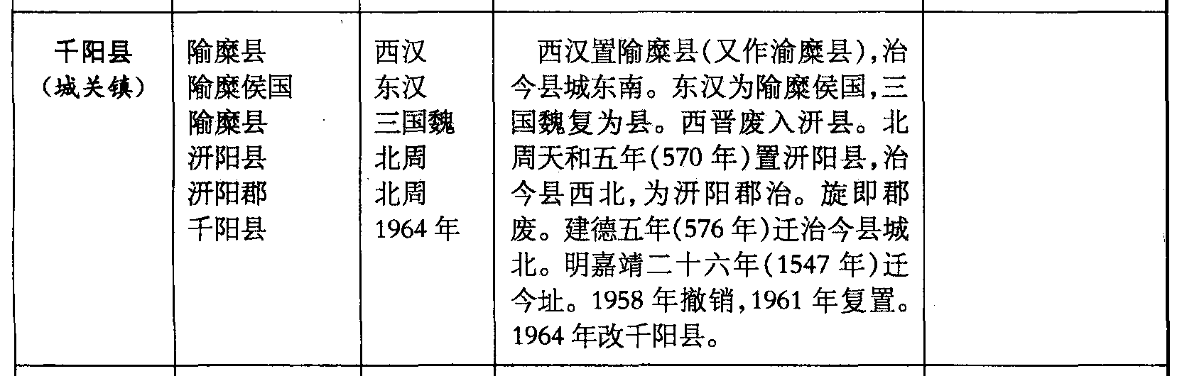 千阳县(城关镇)隃糜县隃糜侯国隃糜县汧阳县汧阳郡千阳县西汉东汉三国魏北周北周1964年西汉置隃糜县(又作渝糜县),治今县城东南。东汉为隃糜侯国,三国魏复为县。西晋废入汧县。北周天和五年(570年)置汧阳县,治今县西北,为汧阳郡治。旋即郡废。建德五年(576年)迁治今县城北。明嘉靖二十六年(1547年)迁今址。1958年撤销,1961年复置。1964年改千阳县。