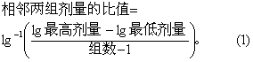 图6 四次实验的剂量对数反应线示意 组(一般5~8组)。要求50%死亡率的上下各有一半组数。剂量分组一般取等比级数,而等差级数较少用。等比级数分组的比值可按下式计算: