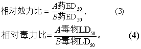 用途 半数效量除用于描述某药物的效应强弱、毒力大小外,还可用于药物间的相互比较,以及毒物的蓄积作用和联合作用分析等。 (1)相对效力比与相对毒力比: 相对效力比是两药物ED50之比,相对毒力比则是两毒物LD50之比。算式如下:
