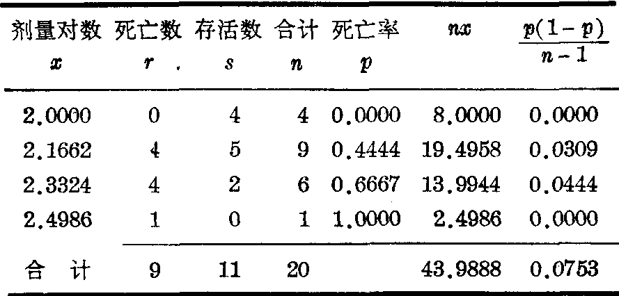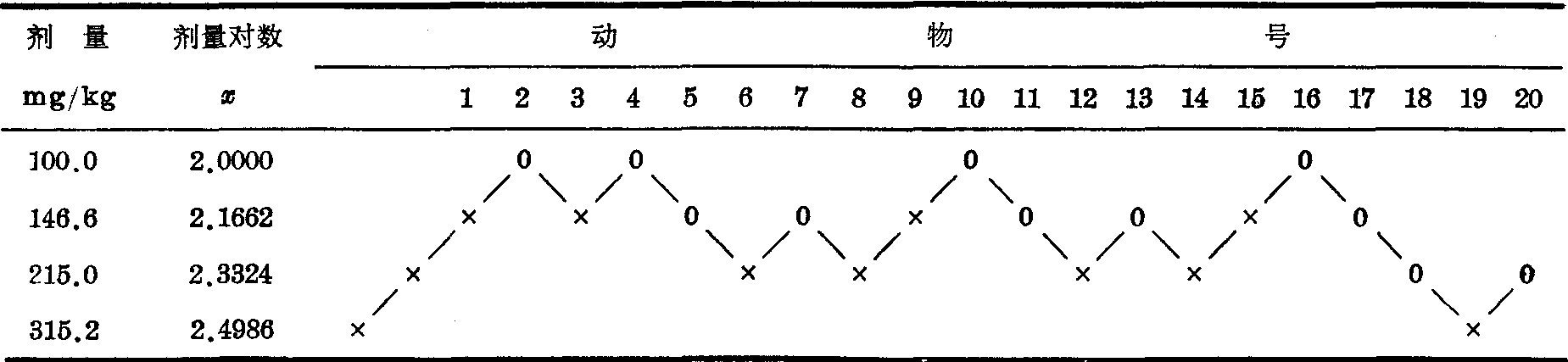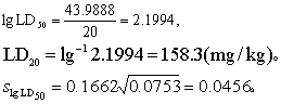 (lgLD50-1.96slgLD50,lgLD50+1.96slgLD50)。(3)例 用某农药对小白鼠进行序贯急性毒性实验,设计及实验结果见表1。两相邻剂量对数的差值d=0.1662,给药从剂量315.2mg/kg开始,实验到四只鼠后,反应符号改变,故从其前一鼠作第1号动物,共用鼠20只。求其半数致死量。 表1 序贯法动物存(0)亡(×)记录
