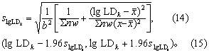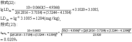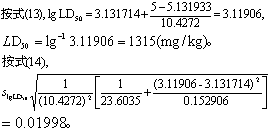 (3)按式(13)可求任何死亡率(k%)时的致死剂量对数(lgLDk),按式(14)求其标准误(slgLDk)。按式(15)求LDk的95%可信区间的对数值,取反对数即得真数值。