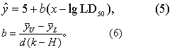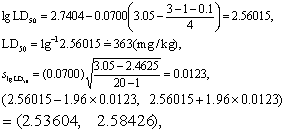 上面求出的LD50是总体LD50的点估计,按正态近似原理,总体LD50的95%可信区间的对数值按式(4)计算, (lgLD50-1.96slgLD50, lgLD50+1.96slgLD ![]() ), (4)取反对数即得真数值。(2) 求剂量(对数)反应(概率单位)回归方程。按式(5)及式(6)计算: