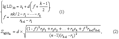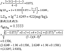 按正态近似原理,总体LD50的95%可信区间的对数值用式(3)计算, (lgLD50-1.96slgLD50,lgLD50+1.96slgLD50),(3)取反对数即得真数值。 角变换法 方法步骤: ❶将反应率作平方根反正弦变换(见条目“百分数p的平方根反正弦变换”),目的是使剂量(对数)反应曲线直线化。 ❷计算移动平均角度。k为3或5个剂量组。 ❸按式(4)作线性内插求LD50。平均角度45°(相当于反应率为50%)所对应的剂量对数即lgLD50,取反对数即LD50。