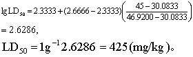取反对数得(214,832)。 该毒物的LD50为422mg/kg,其95%可信区间为214~832mg/kg。 (2)用角变换法求LD50。 查“百分数p与sin-1 对照表”,将表第(5)栏变换为第(6)栏。取k=3,计算移动平均数y,见表第(7)栏。 y=(12.92+26.56+50.77)/3=30.0833,y′=(26.56+50.77+63.43)/3=46.9200。 由表第(2)栏得相应的x=2.3333,x′=2.6666,代入式(4):