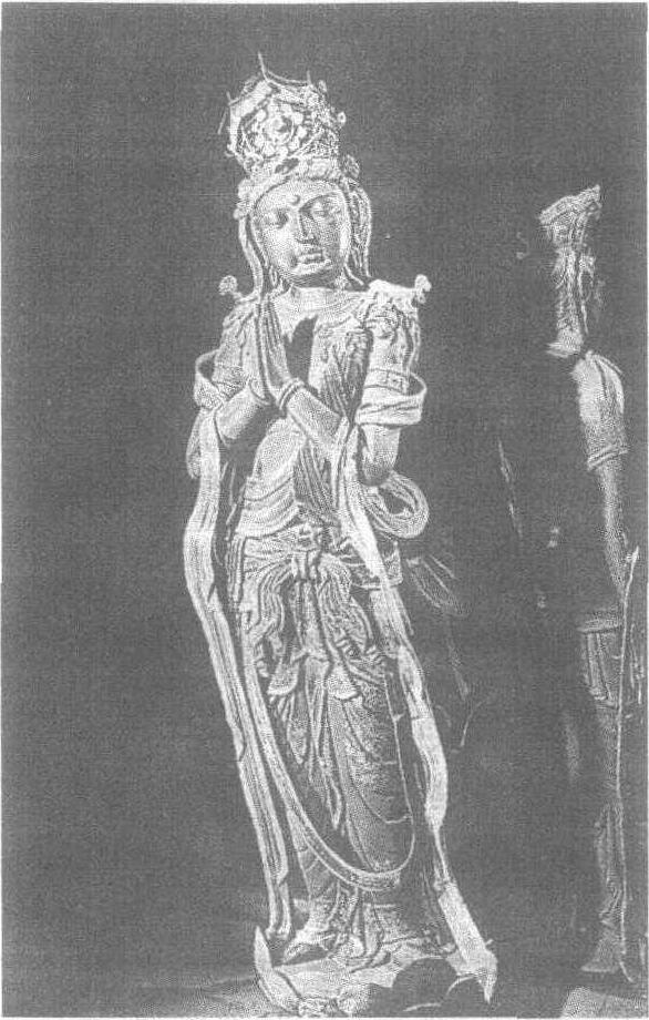 华严寺位于山西省大同市内西南隅。大殿坐西向东,打破一般佛寺坐北朝南的惯例,体现了契丹族东向为尊的习尚。现有两组建筑隔路相望,以大雄宝殿为中心的 一组称上华严寺,以薄伽教藏为中心的 一组称下华严寺。薄伽教藏殿初建于辽兴宗重熙七年(1038年),殿内现存辽代彩塑29尊,表现“三世诸佛,十方菩萨,声闻、罗汉,一切圣贤”。殿内塑像全部妆彩,面部、冠上贴金,妩媚动人。这尊菩萨头戴贴金宝花冠,长圆脸,高鼻梁,方口微启,双目半眯,细长眉形如初月。上身半裸,肩披曳地长巾,双手合十举于胸前如若祈祷。身躯呈S形站立,赤足踏莲花,下身穿拖地彩裤,腰系彩带。辽塑继承唐代雕塑的传统,崇尚华巧、雄健,同时融合本民族的审美习惯,形象细目高鼻,带有契丹族人的特点。