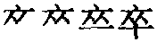 ❹ 贩夫走卒|躬先士卒|身先士卒|无名小卒 卒zú (甲) (篆) 本为指事字,与“衣”有关,甲骨文、金文表现的是一种带特殊花纹的衣服。这种衣服是供服役的人穿的。《说文》:“隶人给事者衣为卒。”后把穿这种衣服的人称为“卒”。这“卒”最早可能与战事相关。中国象棋红方为“兵”(与武器相关),黑方为“卒”(与衣着相关),所以“卒”又是古代军事建制单位。周制,1000人为一“卒”,设“卒长”,相当于现代一个“团”。作声符生成的字有: cù 猝(猝然) cuì 粹(精粹) 翠(翡翠) 瘁(鞠躬尽瘁) 萃(汇萃) 悴(憔悴) 淬(淬火) 啐(表唾弃、斥责或辱骂,多见于早期白话) zuì 醉(酒醉) suì 碎(粉碎) 谇(劝告。“謇朝谇而夕替。”——屈原《离骚》)