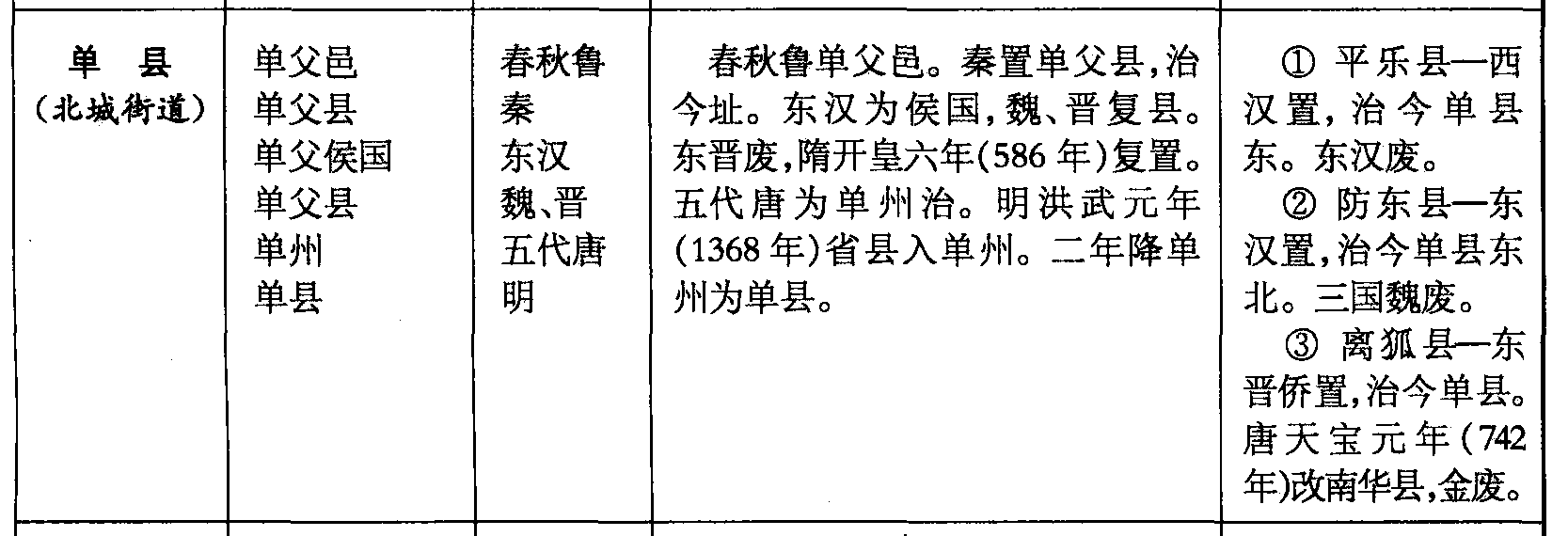单县(北城街道)单父邑单父县单父侯国单父县单州单县春秋鲁秦东汉魏、晋五代唐明春秋鲁单父邑。秦置单父县,治今址。东汉为侯国,魏、晋复县。东晋废,隋开皇六年(586年)复置。五代唐为单州治。明洪武元年(1368年)省县入单州。二年降单州为单县。❶ 平乐县—西汉置,治今单县东。东汉废。❷ 防东县—东汉置,治今单县东北。三国魏废。❸ 离狐县—东晋侨置,治今单县。唐天宝元年(742年)改南华县,金废。