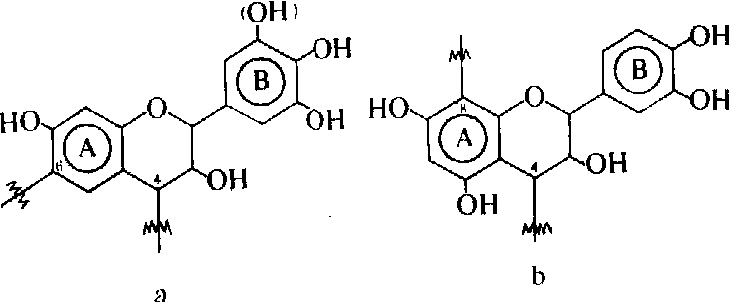 两种不同类型的单宁图 单宁与甲醛作用时,通过亚甲基桥(—CH2—)与A环的反应活性基(4,6位或4,8位)键合生成聚合物,由不溶直至不熔,这是制胶的基本原理。 单宁胶的理化性质包括以下内容: 粘度 随栲胶含固量、栲胶中高分子的树胶量、胶的温度、pH值等变化而改变。单宁胶主要缺点是粘度高,影响施胶。可通过化学处理,降低胶的含固量或添加粘度低的树脂加以改进。 胶凝时间 不同单宁在不同pH值条件下反应活性差别较大。35%浓度的黑荆树、红树和辐射松单宁,pH值6时的胶凝时间分别为56、13和3分钟,说明单宁的反应速度辐射松>红树>黑荆树。 甲醛用量 单宁所需的甲醛量很少。黑荆树单宁需3~4%(作刨花板胶粘剂需6~8%),红树单宁需4%,辐射松单宁需6%的甲醛作交联剂。 从性质上讲,单宁胶应与合成树脂性质相同。如粘度适中,生活力长,有足够的陈化时间,胶合质量达到合成树脂的标准等。 配方应用 单宁胶可分热固(100℃以上固定)和冷固(20~30℃固定)两类。 热固胶配方 热固又分室内和室外两级。单宁代替苯酚制成的胶,主要用来制造室外级刨花板、胶合板、层积板、瓦楞纸板。冷固胶用于指接木和工艺品(如乐器等)制件的粘接。 胶合板用单宁胶的配方 ❶室内级胶。黑荆树单宁(份重)100,水100, 氢氧化钠(1.15)、椰子壳粉(10~15)、多聚甲醛(10)。这种胶质量优于脲醛树脂,但成本较高。 ❷室外级胶。配方如下: