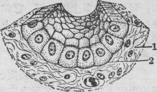 单层立方上皮立体模式图 1.结缔组织 2.单层立方上皮 此种上皮见于肾小管、脉络丛、睫状体、室管膜、晶状体前上皮、视网膜色素上皮、甲状腺滤泡和一些腺的小导管。许多外分泌腺的腺泡细胞也属此种,但有时呈锥体形。各部位上皮细胞的功能不同,大多参与物质输送、吸收或分泌,晶状体前上皮和视网膜色素上皮另有特殊的功能(参见“眼球”条和“视网膜”条)。 ☚ 单层鳞状上皮 单层柱状上皮 ☛ |