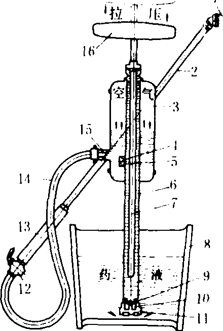 单管喷雾器 1.喷头;2. 手持喷杆;3. 气室;4、9.球阀;5. 出水阀;6.唧筒管;7. 塞杆;8. 药液桶;10. 进水阀; 11. 吸水座;12.截流阀;13.滤网套管;14.喷雾软管;15. 出水接头;16. 木柄 |
