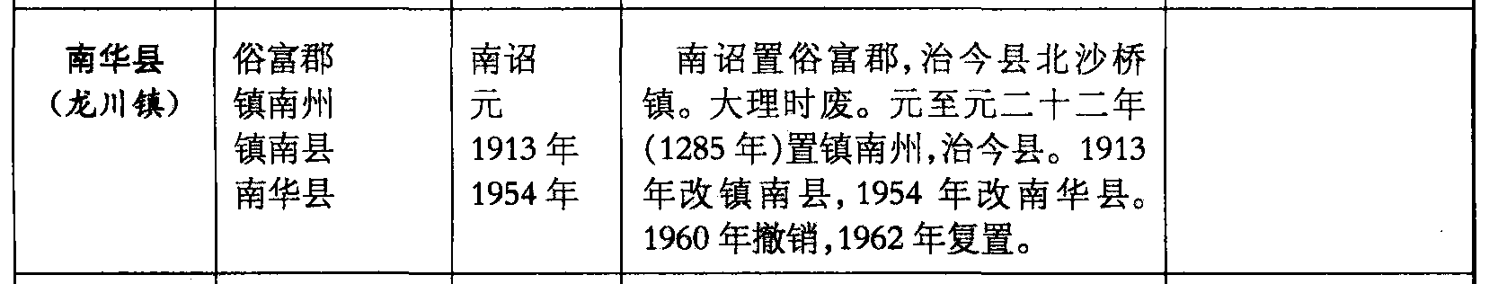 南华县(龙川镇)俗富郡镇南州镇南县南华县南诏元1913年1954年南诏置俗富郡,治今县北沙桥镇。大理时废。元至元二十二年(1285年)置镇南州,治今县。1913年改镇南县,1954年改南华县。1960年撤销,1962年复置。