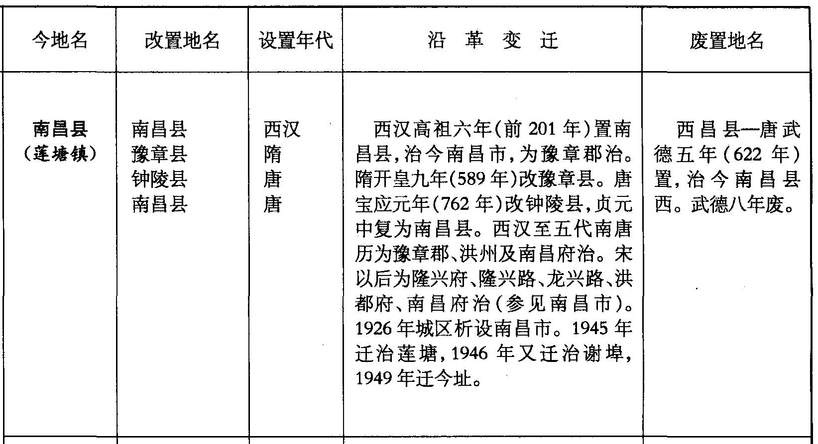 南昌县(莲塘镇)南昌县豫章县钟陵县南昌县西汉隋唐唐西汉高祖六年(前201年)置南昌县,治今南昌市,为豫章郡治。隋开皇九年(589年)改豫章县。唐宝应元年(762年)改钟陵县,贞元中复为南昌县。西汉至五代南唐历为豫章郡、洪州及南昌府治。宋以后为隆兴府、隆兴路、龙兴路、洪都府、南昌府治(参见南昌市)。1926年城区析设南昌市。1945年迁治莲塘,1946年又迁治谢埠,1949年迁今址。西昌县—唐武德五年(622年)置,治今南昌县西。武德八年废。