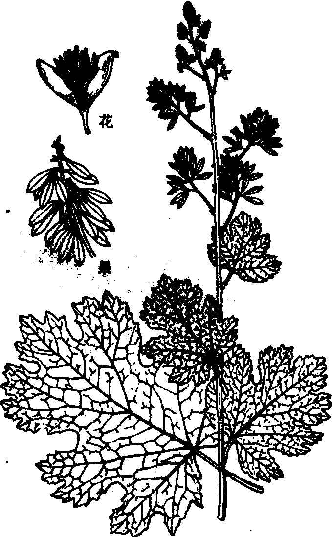 博落回药名。出《本草拾遗》。又名号筒草、号筒杆、泡通珠。为罂粟科植物博落回Ma-cleaya cordata (Willd.)R.Br. 的根或全草。分布长江流域中、下游各地。苦,寒,有毒。消肿解毒,杀虫止痒。治疗疮痈肿,跌打损伤,风湿性关节痛,和酒糟少许捣烂敷; 下肢溃疡,烫伤,研末干撒或调敷;顽癣,蜈蚣、黄蜂螫伤,取汁涂;滴虫性阴道炎,煎水冲洗,或熬膏(每毫升相当于原生药25g) 涂擦阴道壁,每日一二次。不可内服。本品含原阿片碱、α-别隐品碱、白屈菜红碱、血根碱、黄连碱、小檗碱及微量刻叶紫堇明碱(Corysamine)等。根还含白屈菜黄碱、白屈菜玉红碱(Chelirubine)、氧化血根碱及博落回碱(Bocconine)。果实含原阿片碱、α-别隐品碱。生物碱在体外对金黄色葡萄球菌、肺炎球菌、大肠及福氏痢疾等杆菌有抑制作用,并能抗线虫。全草煎剂有抗钩端螺旋体作用。碱有局部麻醉作用。大剂量口服或注射能引起急性心源性脑缺血综合征、中毒乃至死亡。 博落回pink plumepoppyMacleaya cordata(Willd.)R.Br.,罂粟科,博落回属。野生多年生草本。分布于湖南、河北、江西、浙江、江苏、福建、广西、贵州等省区;日本也有分布。生于丘陵、低山草地或林缘。茎被紫色粉,全株含黄色液汁。单叶互生,宽卵形,7或9浅裂,边缘有波状齿,叶背具白粉。圆锥花序;花两性;萼片2枚,黄白色,有时带红色,无花瓣;雄蕊多数;子房上位,2室。蒴果狭长椭圆形,2瓣裂。全草药用。液汁有毒,为除虫剂,杀蛆及农业害虫。浸汁治毒肿、恶疮。为有毒蜜源植物。