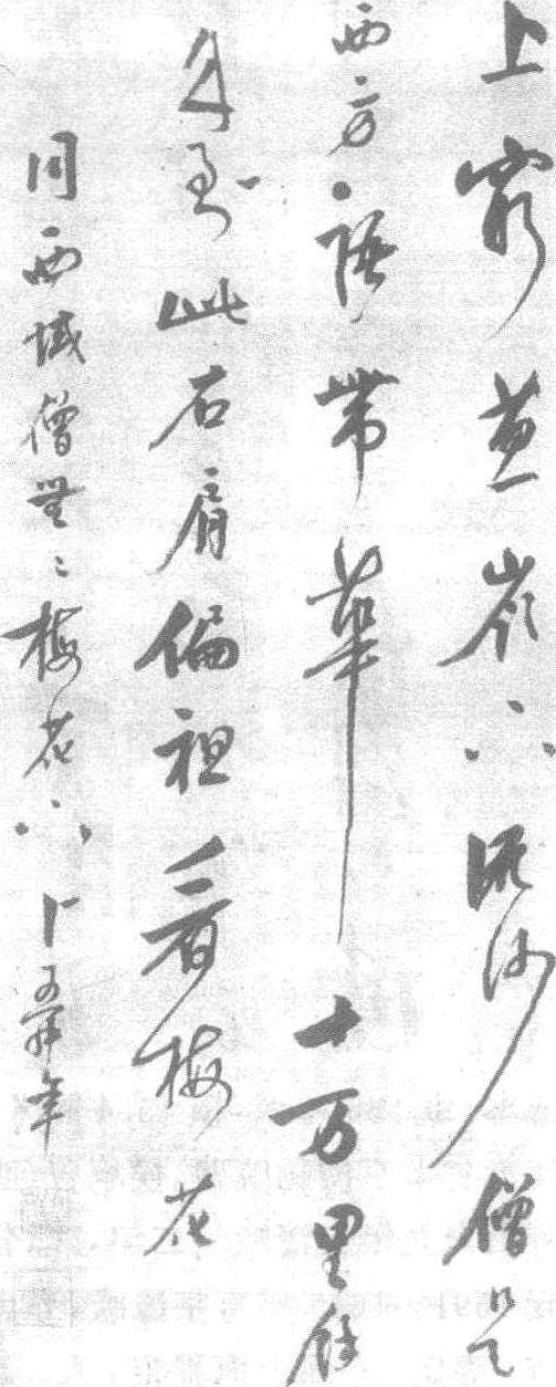 明。纸本。纵58.5厘米,横24.1厘米。江苏省苏州博物馆藏。卜舜年(明万历十五年—万历四十八年,即公元1587—1620年),字孟硕,吴江(今江苏吴县)人,明后期,佯狂至去世,年32岁。工书画,见赏于董其昌、陈继儒,晚年在应酬之作上只题“泥无身”。著有《云芝集》。此幅是卜舜年同西域僧观梅花后兴余之作:“上穷葱岭下流沙,僧是西方语带华。十万里余来至此,右肩偏袒看梅花。”款署“同西域僧无无梅花下,卜舜年。”行书字距、行间疏朗,结字姿态变化有致,字形奇峭,呈挺拔之势,笔致潇洒俊健,魄力雄厚,尤以撇笔而见长,如“沙”、“僧”、“右”、“看”,笔法朴质无华,堪称妙品。