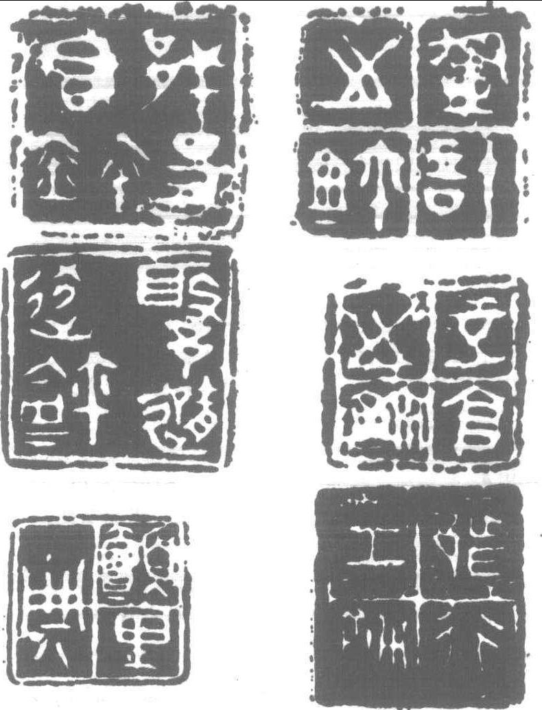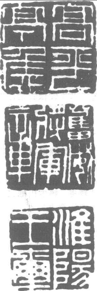 古璽 [印章之歷史] (1) 古璽——春秋戰國時代,印無官私、高下之分,稱為 “璽”,而不稱稱 “印”。是時之印為古璽。清末陳介祺編 《簠齋印集》時,為别於秦漢印章,特置古璽於卷頭。古璽鈕式無論官私,多為壇鈕,而玉璽為覆斗鈕,私璽有鼻鈕、代鈕、亭鈕、烏鈕、默鈕諸類形式,製作精巧。古璽形式獨特,其文字舆 “古泉文”、“古匋文”不同。印制者間有共通文字,堪視為職種類别文字。對此尚欠考究。 (2) 秦印——秦始皇统一天下,建立中央集權官僚制國家。正式確定印製為: 官印方一寸,中有“田”字格,文字刻入格内。半通印《長方印》為“日”字格,私印、吉語印亦多界格。官私印之文字相通,書風近似小篆、權量銘。鈕式多為壇、覆、斗、鼻、魚。 (3) 漢印——前、東漢印之總稱。 ![]()