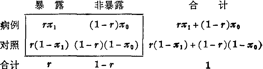 总体相对危险度的95%可信区间为0.62~5.28,包括1在内。亦可得出上述同样结论。 成组病例对照研究 在这类研究中无法直接计算暴露组和非暴露组的发病率,所比较的是病例组和对照组中暴露者所占的比例,并通过计算比数比(详后)来估计相对危险度。分析方法如下: (1) 求比数比ψ。设人群总体中暴露者与非暴露者的发病概率分别为π1和π0,总体中暴露者所占的比例为r,则总体内每一个体出现在下述四种情况中的概率如四个格子内的数值所示。例如,个体属病例又为暴露者的概率为rπ1,余类推。