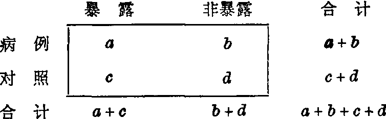 本资料说明男女荨麻疹史对慢性气管炎的发病有相关联系,公共相对危险度的点估计为2.13,其95%可信区间为1.29~3.50。 配对病例对照研究 在这类研究中,对每一病例配以性别、年龄或其他有关条件相似的一个或几个对照,然后比较病例和对照以往暴露于致病因素的经历。在1:1配对情况下,每个对子的调查结果必属于下列四种情况之一: ❶病例和对照均暴露(对子数为a), ❷病例和对照均非暴露(对子数为d), ❸病例暴露而对照非暴露(对子数为b), ❹病例非暴露而对照暴露(对子数为c)。调查结果可整理如下: