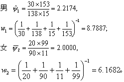 (1)推断男女间两比数比Ψ是否相等。 H0: 男女间Ψ相等, H1: 男女间Ψ不等。 α=0.05。 按式(19)及式(20):