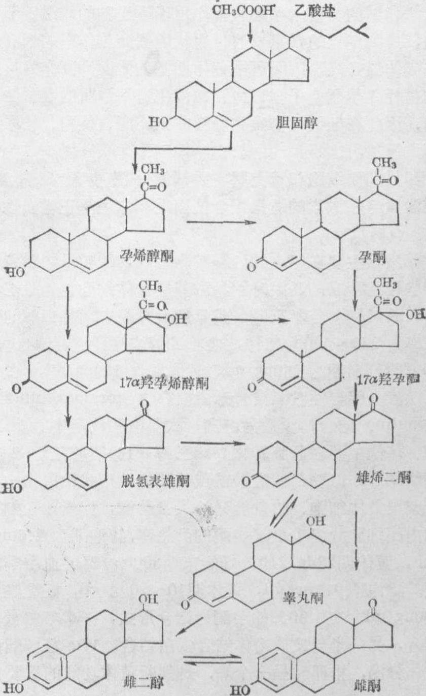 图2 三种雌激素的结构式 雌激素是能引起实验动物动情物质的总称。从人体中已提取出近20种天然雌激素,对其中了解较多的是17β-雌二醇(17β-estradiol)。雌酮(estrone),及雌三醇(est-ciol)。雌二醇的活性最强,雌酮和雌三醇的活性仅为雌二醇的1/10和1/1000。 雌激素可增加子宫去氧核糖核酸 (deoxyribonucleicacid,DNA)、蛋白质的合成,加速细胞分裂,细胞增生与肥大,使子宫内膜发生增殖变化(内膜增厚,腺体、血管和基质细胞增生)。也可促进子宫肌增生,增加肌细胞内肌纤蛋白和肌凝蛋白的含量。在雌激素的作用下子宫肌的膜电位增加,动作电位发放频率增加,子宫肌自发收缩增加,对催产素的敏感性也增加;宫颈分泌大量清亮稀薄的粘液,易拉成丝,内含大量多糖和硫氢基,有利于精子穿透,干燥后出现羊齿植物样结晶;阴道上皮增生,糖元含量增加,粘膜增厚出现皱折,阴道表浅上皮细胞角化,可据以判断体内雌激素的水平;也促进大、小阴唇的发育。小剂量的雌激素可增加输卵管运动,促进卵的输送; 但较大剂量则可使输卵管峡部环形肌持续收缩延缓卵的输送。雌激素还可促进乳腺导管增生,乳头乳晕色素增加; 并可促进卵的发育和延长黄体的寿命,雌激素对下丘脑中枢有反馈作用,小剂量(约30~40μg)可促进LH的分泌,剂量超过80μg时可抑制LH分泌和排卵,这是复方避孕药的主要作用机理。雌激素也作用于下丘脑的血管运动中枢,如绝经时由于雌激素含量减少,血管运动中枢不稳定,妇女常出现面部潮红、夜汗等,而用雌激素则可减轻症状。 在代谢方面,雌激素促进骨钙沉积,降低骨胳对内源性甲状旁腺的反应性,抑制破骨细胞的活动,因而在青春早期女孩生长较快,但同时又促使骨骺闭合,故不能使身高明显增加。绝经后由于雌激素缺乏,骨质吸收加速而造成骨质疏松,引起脊椎压缩,出现老年性弯曲。雌激素可降低血浆胆固醇和胆固醇磷脂之比,α-脂蛋白显著增加,β-脂蛋白减少,有利于抑制冠心病的发展。雌激素也影响体脂分布,形成女性特有的体态。此外,还能促进血管内液体转移到组织间隙,使血容量减少,引起醛固酮分泌,促进肾小管水和钠的重吸收,经前期紧张症的水肿与之有关。 孕激素是在切除卵巢黄体后能维持妊娠的化合物的总称。活性最强的是孕酮(progesterone),此外还有20α-羟孕酮与17α-羟孕酮,其他都是这三种孕激素合成过程中的中间或代谢产物。孕激素主要作用于子宫内膜和子宫肌,有利于孕卵着床和维持妊娠。子宫孕酮受体受雌激素调节,故孕激素必须在雌激素作用的基础上才能发挥作用。孕酮使子宫内膜呈分泌期变化,有利于孕卵在宫内生存;促进子宫内膜间质细胞转化为蜕膜细胞,抑制母体免疫反应,减少子宫肌的自发活动,使子宫处于阻滞状态,有利于胚胎在宫内发育;使宫颈粘液减少变稠,拉丝度减少,中性多糖含量减少,精子难以穿过。在孕酮作用下阴道涂片出现褶卷的嗜碱性细胞,在雌激素的配合下孕酮促进乳腺腺泡发育,孕酮有拮抗醛固酮作用促进尿钠的排泄,但这又代偿性地引起醛固酮的分泌而最后导致水和钠的潴留。孕酮直接作用于下丘脑的体温调节中枢,提高定点的水平或通过甲状腺素产热作用的增高使基础体温升高,因而可用黄体期基础体温升高作为排卵的指标。孕酮使子宫、血管和消化道平滑肌的紧张性下降,因此在妊娠时易发生静脉曲张、痔、便秘、输尿管积水等情况。 卵巢间质细胞和肾上腺皮质都能分泌少量雄激素。雄激素与雌激素的适量配合使阴毛和体毛呈正常女性分布。 雌激素主要在卵泡的内膜细胞合成,颗粒及内膜黄体细胞也能合成。妊娠时胎盘滋养层合体细胞也能分泌大量雌激素特别是雌三醇。成年妇女月经中期雌二醇的产生率为250~500ng/24h,血雌二醇浓度卵泡期为50pg/ml,排卵前期为250pg/ml,黄体期为129pg/ml,血中雌激素大部与性激素结合球蛋白(sex hormone bindingglobulin) 结合,少量为游离形式具有生物活性。雌二醇、雌酮主要在肝脏转化为雌三醇或16-表雌三醇,2-羟基雌酮等,以葡萄糖醛酸甙或硫酸盐的形式由尿排出。 卵巢黄体细胞、胎盘能分泌大量孕酮,卵巢颗粒细胞和内膜细胞分泌少量。孕酮的产生率,滤泡期为2.6mg/24h,黄体期22ng/24h,妊娠末期300mg/24h。血孕酮浓度,滤泡期0.5ng/ml,黄体期10~20ng/ml,妊娠晚期200ng/ml。血中90%的孕酮为结合形式,一半与白蛋白结合,另一半与皮质甾体结合蛋白结合。17α-羟孕酮由黄体分泌,排卵时呈一个峰,是判断黄体功能的重要指标。 孕酮为体内其他甾体激素的前身可形成各种有活性的代谢产物。孕酮主要在肝脏灭活,还原为孕烯二醇酮、孕烯二醇、孕烯三醇。从尿中排出。 雌、孕、雄激素的合成途径是类似的,都是由胆固醇(来自血浆或细胞利用乙酸盐合成的)转化而成。胆固醇在羟化酶作用下,在辅酶Ⅱ和分子氧存在下在20α和22R位羟化,后者在20、22裂解酶作用下形成孕烯醇酮(pre-gnenlone)。孕烯醇酮是合成一切甾体激素的关键性中间体。在异构酶作用下它可转变双键的位置 (将5、6碳原子之间变为位于4、5碳原子之间),在3β羟甾体脱氢酶作用下将3位的羟基转变为酮基形成孕酮。另外孕烯醇酮在17-羟化酶作用下可转化为17-羟孕烯醇酮,后者在裂解酶作用下除去20、21位碳原子产生脱氢表雄酮(dehydroepiandrosterone);在异构酶和3β羟甾体脱氢酶作用下形成雄烯二酮(androstenedione);在17-羟化甾体脱氢酶作用下,雄烯二