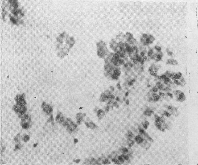 图1 卵巢浆液性乳头状囊腺瘤 交界性浆液性囊腺瘤 是一种在外观上与良性浆液性囊腺瘤无明显区别而在组织学及生物学特性上介于良性与恶性之间的肿瘤(图2)。它可以复发及有大网膜及腹膜种植,但其预后较恶性者好,10年存活率为95%,大体检查,双侧的交界性浆液性囊腺瘤较良性者多见,乳头状物的数目亦较良性者多,有时可穿破包膜达肿瘤表面。镜下可见 ❶乳头上皮增生而成上皮簇。 ❷上皮细胞呈复层(不超过三层),有轻或中度间变。 ❸可见核分裂相,但每高倍视野不超过一个。 ❹无肿瘤间质浸润。