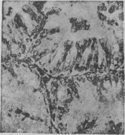 图2 卵巢交界性粘液性乳头状囊腺瘤 卵巢粘液性囊腺瘤破裂或经穿刺内容物流出后,瘤细胞可种植于腹膜上产生大量粘液,形成假粘液性腹膜炎。患者常诉腹胀,腹围增大,消瘦,甚至呈恶病质。此种种植病灶不易用手术清除,即使能割除多数病例再发。 粘液性囊腺癌 占卵巢恶性肿瘤的3~10%,多发生于40~60岁。 肿瘤为囊性,但有明显的实质区,直径可达50cm,表面光滑,有时有包膜浸润,与周围组织或器官粘连,切面亦为多房性,常有出血坏死。囊内容物多为混浊或血性。镜下可见上皮细胞增生明显,多在四层以上,排成蜂窝状或呈乳头状,其层次紊乱,极性丧失,细胞大小不一,有明显间变,胞浆内的粘液不明显,有时分泌旺盛形成粘液湖,可见核分裂相(图3)。