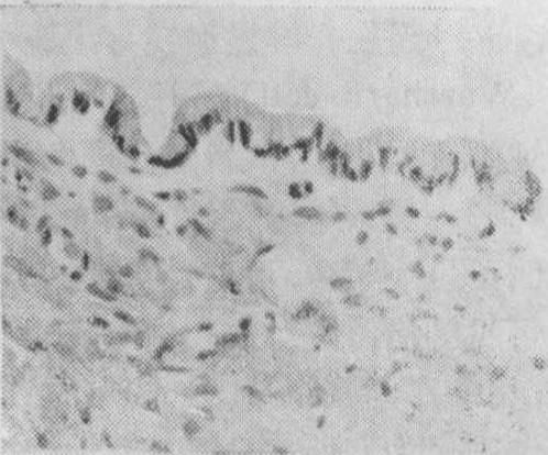 图1 卵巢粘液性囊腺瘤 交界性粘液性囊腺瘤 在组织学及生物活性上介于良性及恶性间的肿瘤(图2),可以复发或有大网膜、腹膜的种植。其乳头状物数目较良性多。但预后较恶性者为佳。镜下诊断标准与交界性浆液性囊腺瘤相同(参见“卵巢浆液性肿瘤”)。