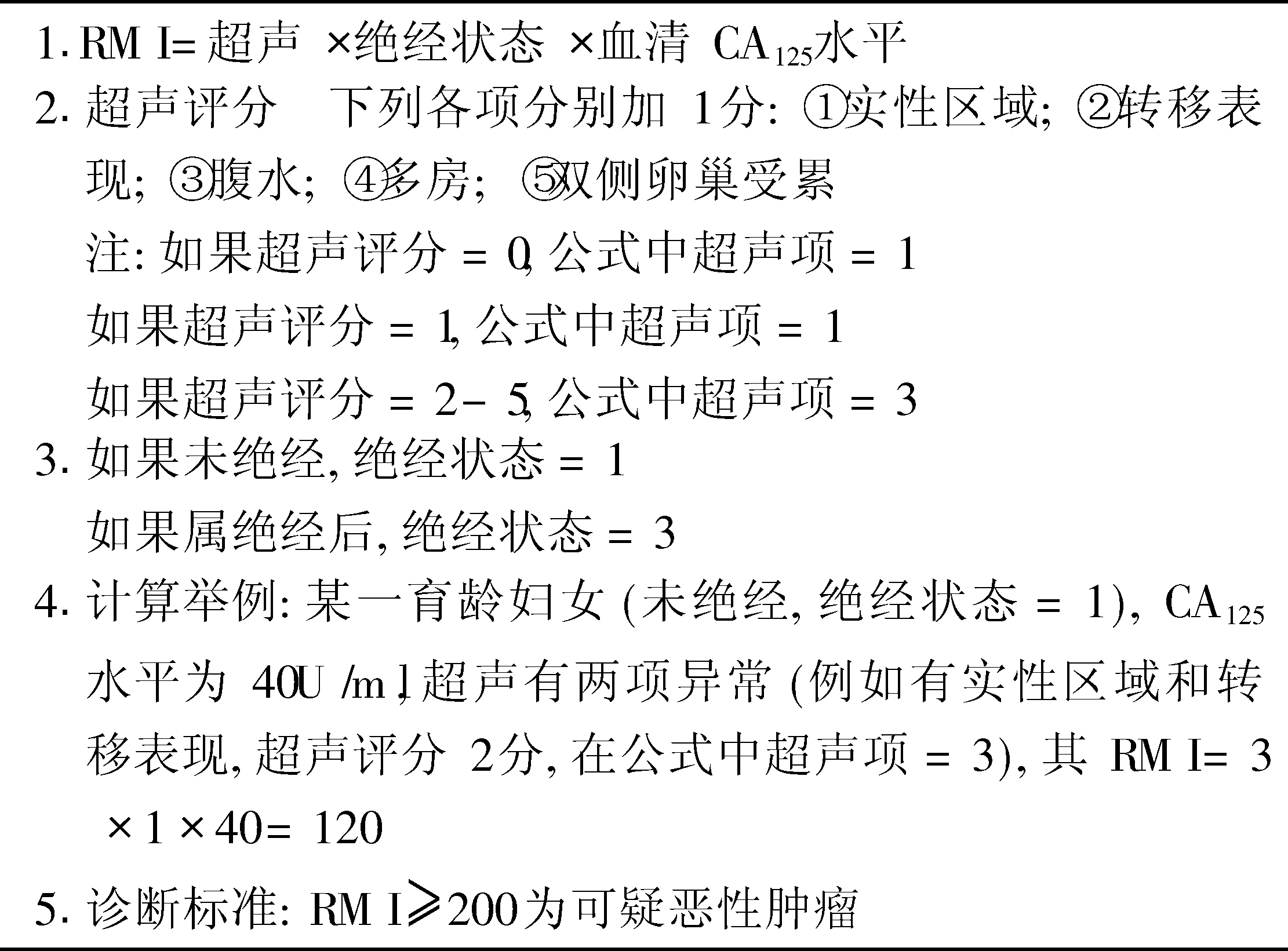 | 释义 | 卵巢肿瘤评分系统 卵巢肿瘤评分系统score system of ovarian tumor为更好地筛查和评判卵巢肿瘤,现将几种评价方法分别介绍。见表1~7。 表1 Depriest超声评分系统(1993) Depriest所制定的超声评分系统主要用于卵巢癌筛查。3220例被筛查者中44例(1.4%)存在卵巢形态或体积异常,其中评分>5的有9例行剖腹探查,3例术后病理证实为卵巢癌。 表2 Benacerraf超声评分系统(1994) 表3 Jacobs恶性危险指数评分系统(1996) 表4 Prompeler的“恶性可能性”计算方法(1997) Caruso等自行设计了一种CDFI诊断评分标准(见表5)。良性肿瘤和恶性肿瘤的平均血管评分分别是1.06±1.97和8.34±1.12(P<0.001)。规定评分≥5者为可疑卵巢癌。诊断的敏感性、特异性、阳性预测值和阴性预测值分别是100%,92%,72%和100%。 表5 Caruso彩色多普勒血流和频谱分析评分(1996) 表6 Sassone评分系统 表7 Lerner评分系统 ☚ 卵巢肿瘤面容 子宫内膜异位症的分期 ☛ |