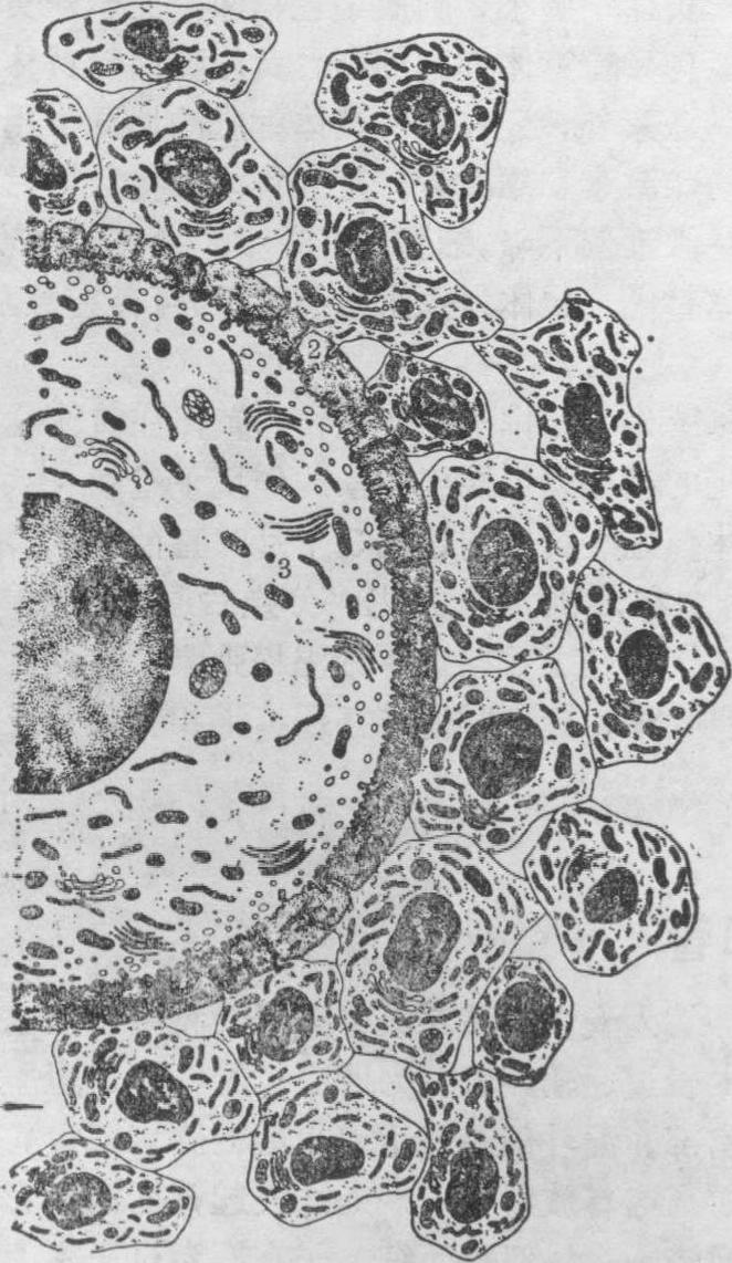 图1 卵母细胞、透明带和卵泡细胞的超微结构 1.卵泡细胞 2.透明带 3.卵母细胞 次级卵泡 为出现卵泡腔的卵泡。当卵泡细胞增加到6~12层时,细胞间出现一些不规则的小腔,内含透明的液体,称卵泡液。卵泡细胞之间可有小量深染物质积存。呈PAS阳性反应,直径可达50μm,称Call-Exner体,是卵泡液的前身物质。随着卵泡液的增加,小腔逐渐合并成一个较大的卵泡腔,腔内充满卵泡液。卵泡液透明,有粘性,富有透明质酸,含性激素和营养物,可为卵细胞和卵泡细胞提供营养。卵泡腔形成后卵母细胞不再长大。由于卵泡液不断增多,卵泡腔继续扩大,将初级卵母细胞及其周围的一些卵泡细胞挤到卵泡的一侧,形成一个凸入卵泡腔的隆起,称卵丘。卵母细胞直径可达125~150μm。紧靠卵母细胞的一层卵泡细胞呈柱状,围着卵母细胞呈放射状排列,故称放射冠。其余构成卵泡壁的卵泡细胞排成数层,称为粒层。此时,卵泡膜的内外两层更为明显。具有大卵泡腔的次级卵泡也称为囊状卵泡。 在卵泡发育过程中,初级卵泡的发育不受促性腺激素影响。出现卵泡腔后卵泡的发育受促性腺激素、尤其是卵泡刺激素的调节。卵泡细胞及卵泡膜内层细胞先后出现卵泡刺激素受体和黄体生成素受体等,这些受体与相应的激素结合,调节卵泡细胞增生、分化及合成类固醇激素。 成熟卵泡 次级卵泡发育到最后阶段为成熟卵泡,又称Graaf卵泡(图2)。此时卵泡的直径可达1cm左右,向卵巢表面突出,卵泡腔很大。卵泡细胞增殖缓慢,至最后停止,粒层相对地变薄。卵泡膜内层细胞为梭形或多角形细胞,胞质充满了细小脂滴。电镜下,胞质内有很发达的滑面内质网、粗面内质网、游离核糖体和一些溶酶体,线粒体内有管状嵴。卵泡膜外层由同心排列的成纤维细胞及胶原纤维组成。排卵前成熟卵泡又进一步发育和长大,称排卵前卵泡。人类卵泡从生长到成熟一般须要10~14天。排卵前初级卵母细胞完成第一次成熟分裂,生成次级卵母细胞和第一极体(参见“卵子发生”条)。