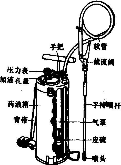 背负式压缩喷雾器 压缩喷雾器结构简单、价格低廉、使用方便,适用于庭园、室内及田间喷洒农药和液肥等,并在卫生防疫等方面已广泛应用。肩挂和背负作业的压缩喷雾器的药液箱容量通常不大于15升,工作压力不超过700千帕,净重不超过6~8千克。 |