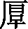 ❹ 得天独厚|恩高义厚|弘毅宽厚|局高蹐厚|踞高蹐厚|情深意厚|天高地厚|温柔敦厚|物薄情厚|宅心仁厚 厚厚,甲骨文作 ,金文作   ,《説文》古文作 ,小篆作 。 从厂 (hǎn)从𣆪。“𣆪” 即古 “厚”字, 或作 “㫗”,則 “厚”爲“㫗”字的增形。唐蘭説,“罈”“厚”古音相近,“𣆪”是 “罈”(覃)的初文。“厂”是石崖,《説文》據 “厚”字从厂而訓爲山陵之厚,當是又一義。文獻多表示豐厚、厚重、忠厚等義。卜辭多用作人名。銘文或用厚重、繁多、盛大等義,或用作氏族名、人名。 楚簡帛文作 ,字形多樣,多有訛變。秦簡牘文作 ,與小篆形近。 厚hòu(9画)