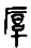 ☚ 覃 畗部 ☛ 厚hòu甲骨文和西周金文中是会意字。从厂(本读hǎn,本山岩形),从倒享(亯)。享本象宗庙形,祭祀供奉;厂也代表房屋。在房中不奉人而自奉,有丰厚、富厚义。《说文》说倒“享”字就是厚字。引申为长宽厚的厚。又是厚薄的厚。又表示深、重、浓、大义。如:厚望|厚味。又引申为不刻薄,待人好。如:厚道。 厚★常◎常