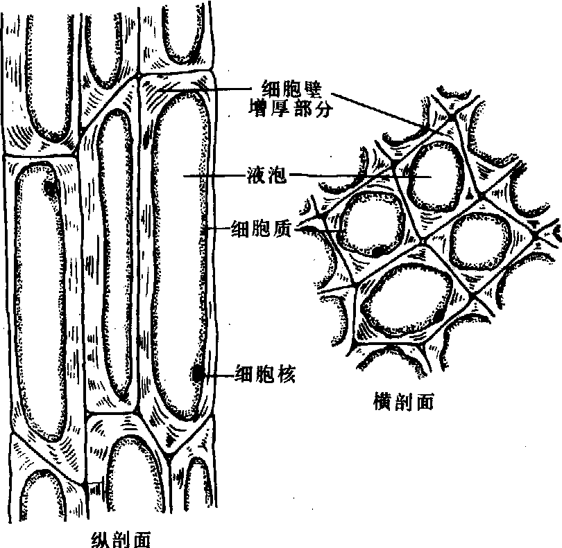 | 释义 | 厚角组织collenchyma初生壁局部加厚的生活细胞所组成的一种机械组织。厚角组织存在于茎、叶柄、花柄、果柄等尚在生长的器官,在一定程度上能适应器官的迅速生长。在茎或叶柄中,厚角组织常靠近表皮呈连续筒状或分离成束状分布。在叶片内,往往分布于较大叶脉的表皮内侧(见图)。根内很少有厚角组织存在,但当其暴露于空气中则常可发生,如龟背竹。