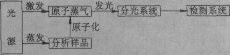 图1 发射光谱仪方框图 主要的仪器类型有火焰分光光度计、摄谱仪、光电直读光谱仪、ICP光源发射光谱仪等。 火焰分光光度计 使用滤光片作为分光元件的称为火焰光度计;采用棱镜或光栅为分光元件的称为火焰分光光度计。火焰发射光谱法具有设备简单、光谱线少等优点。但由于火焰温度较低,只能激发具有低激发能态的原子,特别适合于碱金属和碱土金属的分析。火焰分光光度计由火焰光源、原子化器、分光元件、光电检测器、放大器和显示记录装置等组成。 摄谱仪 用照像方法把光谱记录在光谱底板上的光谱仪器。根据分光系统不同,可分为棱镜摄谱仪、光栅摄谱仪和干涉分光摄谱仪。根据分光性能的不同,可分为小型摄谱仪、中型摄谱仪、大型摄谱仪和高色散率摄谱仪。与摄谱仪相配套的附属设备还有激发光源、光谱投影仪和测微光度计等。光谱投影仪可把摄谱仪摄下的光谱底板在仪器上投影放大,与已知物质光谱或标准光谱谱线作比较,是光谱定性和半定量分析的主要工具;测微光度计用来测定光谱底板上谱线的黑度,是进行定量分析的工具。 光电直读光谱仪 利用光电测量方法直接测定谱线强度的仪器。谱线接收器由出射狭缝和光电倍增管等组成,有两种接收谱线的方式。一是扫描式,即接收器在焦面上移动的方式。接收器数目可以少至两个,一个逐条接收分析线,另一个接收内标线,因而成为双光道的仪器。二是固定接收器式,即在焦面上安装许多个固定的接收器。每一个分析线都有一个接收器,因而成为多光道的仪器。为了能分析那些分析线位于真空紫外区的元素,避免空气对辐射的吸收,可将光电直读光谱仪的光学系统置于真空中。这样的仪器称为真空光电直读光谱仪,又称真空光量计。 ICP光源发射光谱仪 利用高频电感耦合等离子体作为激发光源。装置由一个石英管和环绕着它的通水冷却的几匝铜管线圈组成。当线圈中通过高频电流时,产生强烈振荡的磁场,其能量耦合到石英管内,用微电花引发管内氩气电离,便产生等离子体焰炬,温度可高达10 000K左右。使用ICP光源的特点是灵敏度高、稳定性好、分析范围宽、基体效应和化学干扰小。将ICP光源与电子计算机控制的高度自动化的多道式或扫描式光电直读光谱仪相结合,使ICP光源的特点与原子发射光谱能进行多元素同时分析的优点相得益彰。图2是一台ICP光源发射光谱仪的外形,图3是ICP光源点燃后的情景。