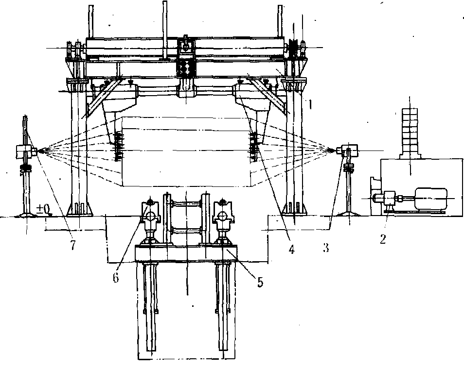 图1 机械三点定心上木机 光环投影定心上木装置 利用两组光环发生器放映的同心圆环投影到木段两端,放映的光环中心与旋切机卡轴中心线水平一致(图2)。经操作人员目测,操纵液压系统的升降、左右移动油缸来调整V型托架,使光环中心与木段最大圆柱体的中心线重合,实现定中心。定好中心的木段由分离的行车上的一对卡木臂卡紧,送至旋切机前等待位置或旋切机卡轴位置。由于光环投影定心需依靠操作人员目测,因此定心精度受到影响,通常适用于大径级木段的定中心。