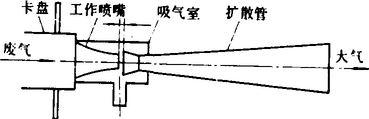 图1 自吸式厩液施洒机 引射器的结构和工作原理如图2所示。在吸肥过程中,柴油机排出的废气流经引射器,在工作喷嘴内流速增大,压力降低,从而使吸气室内的真空度增加;并通过吸气室接口所装的吸气胶管与液肥罐接通,使液肥罐内处于负压状态,液肥池内的液肥在大气压力作用下连续不断地流入罐内。当需要压出液肥时,将引射器改换为加压盖,通过加压胶管(与吸气管共用)使排气管与液肥罐直接连通,对液肥罐增压,加速液肥从尾管流出,并压送到一定高度。与小型拖拉机配用的自吸式厩液施洒机的压肥高度可达4米,吸满一罐需4~6分钟。
