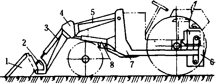 液压卸载前置式厩肥装载机 1.铲斗; 2.快速连接机构;3.转斗液压缸; 4.平衡机构;5.提升臂;6.配重机构;7.连接架;8.举升液压缸 作,在2~3分钟内即可完成挂接动作。与销轴式连接相比,可提高挂接速度15~20倍。铲斗通过卸载机构将厩肥按要求卸到运输车上。液压卸载机构由转斗液压缸与卸载连杆机构组成。其特点是卸载平稳,铲斗充满系数较高,但结构较复杂,成本高。常见的机械卸载机构为手动或脚踏的弹簧插销机构。结构简单,使用可靠。厩肥装载机若装备不同型式的工作部件,如铲叉、抓斗等则可通用于装载其他散状物料,如土壤、砂石、水泥、粮食、煤炭、茎秆和块茎等。 厩肥装载机manure loader将成堆的厩肥装入撒肥机的机具。一般为悬挂式,安装在拖拉机前部,起重臂支架后端铰接在拖拉机后轴的套筒上,前端装有可上下翻动的铲斗,起重臂支架由液压油缸和挺杆带动起落。工作时,由驾驶员操纵,完成铲肥、运肥、卸肥等动作。 |
