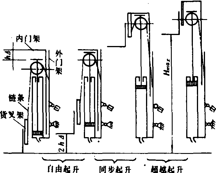 图2 部分自由提升的叉车起升过程示意图 特性 叉车具有一般工程车辆的各种性能,对其各种工况的稳定性要求更为严格。中国标准GB5141—85(等同ISO1074—1975)规定了叉车在水平地面满载堆垛和满载运行时的纵向稳定性指标,以及在满载堆垛和空载运行时横向稳定性指标。在不能满足上述稳定性指标的情况下,通常采用改变叉车自重重心位置及重量来调整。重心越低,有利于提高叉车的纵向和横向稳定性;重心越靠后方,纵向稳定性越高,但横向稳定性差。只有确定合理的重心位置,才能全面地满足上述四种状态的稳定性要求,保证叉车安全作业。 趋势 随着国民经济的发展,叉车的使用范围将进一步扩大。在中国,中小型内燃叉车的生产发展较快,而蓄电池叉车性能的改进有赖于牵引蓄电池、控制电器和低速大扭矩电机等基础件性能的提高。叉车技术发展趋势:❶重视人体工效学研究,发展叉车适用的动力机等部件,减少排气污染和降低噪声,提高操作舒适性和安全性; ❷应用电子控制技术,增加叉车功能,如叉车自动称重和货叉自动对位,减少能源消耗,如势能回收和变矩器电子控制调节; ❸叉车作业应用计算机控制,充分发挥叉车效能。 叉车forklifttruck在汽车或特种车辆底盘上装有货叉和门架等工作机构的装卸搬运机械。采用液力机械传动居多,由动力装置、车架、工作机构、行走机构和转向机构等组成。按货叉的安装位置分正面叉车和侧面叉车。正面叉车的货叉位于叉车前轮的前方,这类叉车型式较多,以平衡重叉车为主,其车架后面装有平衡重,以保持满载时的稳定性。货叉依靠液压油缸升降,门架倾斜和行走机构运动铲运短件货物。它机动灵活,装卸效率高。侧面叉车的货叉位于叉车前进方向的侧面,其货叉除升降和倾斜外,还可以沿车身侧面伸缩,将铲装的长件货物放在车架的货台上,并作短距离运输。它没有正面叉车机动灵活,装卸效率低。叉车适用工矿企业、车站、码头和贮木场等部门。