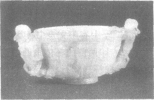 | 释义 | 双人耳礼乐玉杯 双人耳礼乐玉杯元。通耳高7.2厘米,口径11厘米。北京故宫博物院藏。白玉琢制,玉质润泽,局部有黄色浸痕。杯口微撇,弧形壁较深,圈足规整,有凸雕的童子人形耳。童子面如满月,头梳两辫,身着宽袖衫,脚踩祥云,双手攀于杯沿,形象十分可爱。杯内壁和底部浮雕32朵如意形云头纹,碗外壁浮雕通景画一幅:10位仕女或坐或立,持琵琶、笛子、箫等不同乐器,俨然是奏乐场面。杯口沿有阴刻连珠纹一周。