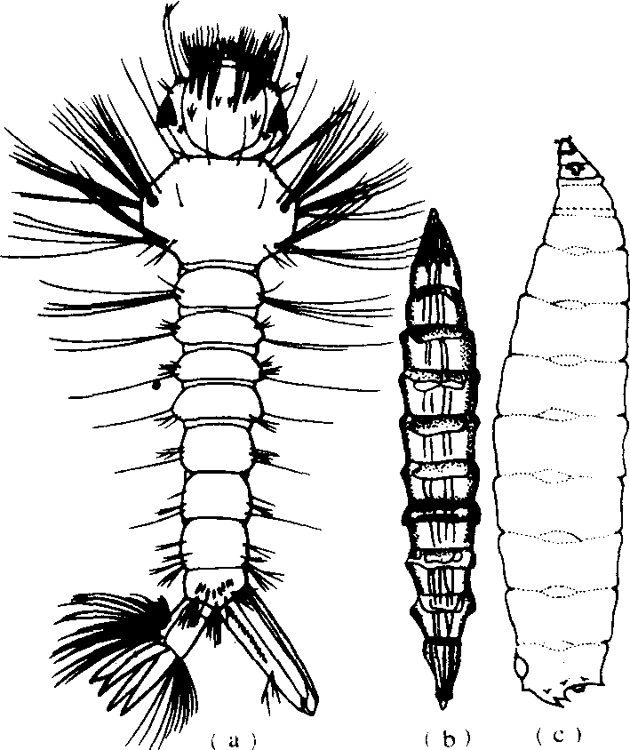 复眼发达,单眼2~3个或缺如; 口器舐吸式或刺吸式,上颚很少存在,下唇端部常膨大成唇瓣。前、后胸退化,中胸特别发达,具翅一对,膜质,极善飞翔,后翅退化成平衡棒,极少种类翅退化或缺如; 翅脉常有消失或合并现象; 在食蚜蝇科中,R4+5 脉与M1+2脉间有一条褶皱状或骨化的伪脉,为识别此科的主要特征。足3对,短或很长,跗节5节,爪及爪垫各一对,一般有一个爪间突。腹部分节明显,蚊类中一般分为11节,蝇类中仅能够见到4或5节,末端数节形成尾器。在雄性长角亚目中第九或第九、十腹节有抱器,在环裂亚目中则有肛尾叶(即尾须)和侧尾叶(surstyli),合称尾叶,交配时起抱握作用; 雄性交配器主要为阳体及阳基侧突; 雌性蚊类一般第九、十节缩入体内不易见,蝇类中第六至八节形成产卵管,节间膜极发达,能伸缩套叠,静止时隐藏腹内不外露。 习性 大都两性生殖,卵生,某些环裂亚目伪胎生和胎生,前者卵期在雌性体内发育成熟,产下的卵立即孵化,后者如蛹蝇类,其雌体产下的为前蛹期幼虫,不取食即化蛹;此外也有少数种类进行孤雌生殖(在毛蠓科及摇蚊科中可见)及幼体生殖(某些瘿蚊科的种类)。卵一般单产或成块堆在食物上、食物中或产于幼虫栖息场所,也有产卵在水下、土中,植物的组织内部或活的寄主体内、体表。卵长卵圆形或纺锤形,卵壳表面平滑或常具细微刻纹。幼虫俗称“蛆”,无真正分节的足,体分节,头有或无,口器不显著,眼常缺如。通常有3种类型(图2):❶全头型:头部发达、完整,如蚊类幼虫; ❷半头型:头的后部及口器或多或少退化、不完整,部分缩入胸部,如虻类幼虫; ❸无头型:头部不明显,口器退化,仅有1~2个口钩,如蝇蛆。大部分长角亚目幼虫分4龄 (蚋科Simuliidae6龄)、短角亚目5~8龄、环裂亚目3龄。蛹一般有两种类型(图3 ):❶裸蛹。全身裸出或称自由蛹; ❷围蛹。全身完全被包在由末龄幼虫体壁硬化而成的桶状蛹壳中。成虫羽化有两种方式:❶直裂。成虫羽化时由蛹背呈“T”形裂开,如蚊和虻; ❷环裂。成虫羽化时由蛹的前端呈环状裂开,如蝇类。
